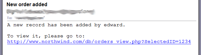 To send a notification email when an existing record is modified, you can apply the same procedure above to the orders_update() function in the same file. To send a notification email when a record has been deleted, apply the same procedure to the orders_delete() function.Sometimes, you might want to send the notification email to the user who added/modified the record. AppGini stores users' email addresses in the database table called membership_users. So, we need to query that table to get the user's email address. Here is the code above after modifying it to send a notification to the user who added the record: