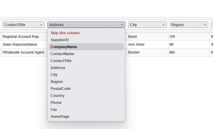 If field names in the CSV file match the field names of any table in your application, the table name and field mapping would be automatically configured. This means you won't have to manually map the fields, saving you time, effort, and potential errors. You can still adjust the mapping and/or skip fields if needed. To do so, open the dropdown menu on top of the column you'd like to remap. This will allow you to skip the mapping for that specific column, or select a different field from the table to map it to.